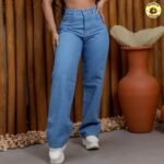 Calça Jeans Feminina Cintura Alta Wide Leg Com Bolso